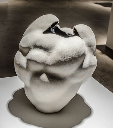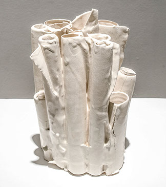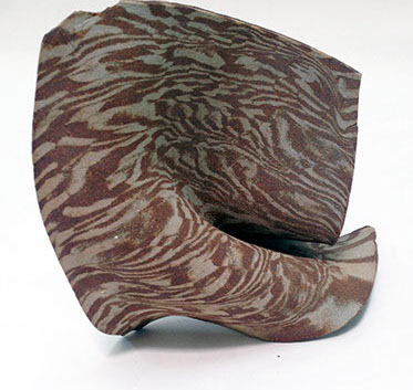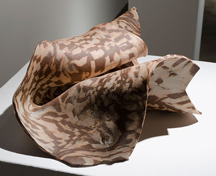 The ceramic pieces are made using an old Japanese technique called neriage or nerikomi, in which different colored clay bodies are layered to build a grid pattern. The grid is distorted as the clay slab is laid over an armature that holds its drapery-like form. The two natural colored clay bodies are unglazed and un-pigmented. Consequently, the pushing and pulling of the grid is not a skin on the exterior, but rather visual evidence of the physical distortions of the clay itself. The marbled folds are reminiscent of Devonian colored sandstone and Hungarian red nodular limestone statues from the Romanesque period. The folds recall cloth adorning an absent body, or the topology of an undulating landscape.