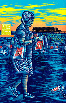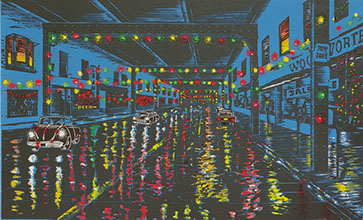 His work reflects the beauty for the city that surrounds him with a nostalgia for its aging, but unique storefronts, signage and architecture from all areas of Los Angeles including the Valley, glamorous Hollywood, and especially his current home in Downtown LA. The urban landscape, complete with its burnt-out, broken neon signs, its faded and peeling movie posters and billboards, its web of power-lines and telephone wires overhead, and the occasional intricately-painted graffiti piece serve as the perfect inspiration for his detailed, very limited-edition, reduction linoleum block prints.