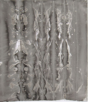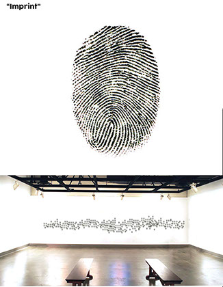 Imprint can only be fully realized with the participation of gallery visitors and staff. An ink pad will be mounted near the wall that the piece inhabits. Gallery visitors will be encouraged to ink their finger and leave their fingerprint on the wall. The staggered prints will create a pattern like wave across the wall. Its form will slowly change as people participate.